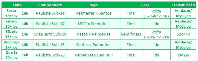 No domingo, acontece o primeiro jogo entre Palmeiras e Santos, pelas finais do paulista Sub-15. E na quarta-feira, o time Sub-20 volta a campo, desta vez pela partida de ida do paulista da categoria, recebendo o Red Bull, em busca do tricampeonato.