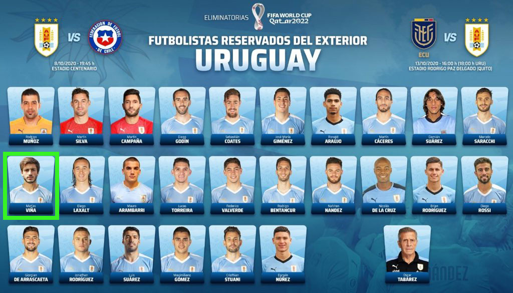 A exemplo da seleção da CBF, a convocação uruguaia desfalcará o Palmeiras: o lateral Matías Viña está na lista de relacionados e pode desfalcar, dependendo da logística, de até três partidas no Brasileirão.