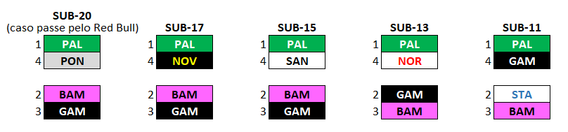 Os times Sub-15 e Sub-17 avançaram esta manhã às semifinais do Campeonato Paulista com as melhores campanhas e terão a vantagem dos mandos. Os times Sub-13 e Sub-11 também haviam alcançado o mesmo feito; desta forma, o domínio do Palmeiras nas categorias de base é completo, até agora: em todas as categorias em que as semifinais estão definidas, o Palmeiras avançou como melhor colocado.