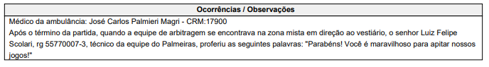 Na súmula, Luiz Flávio de Oliveira relatou que Felipão se dirigiu a ele na zona mista, após o jogo, e disse que ele era “maravilhoso” para apitar as partidas do Palmeiras.